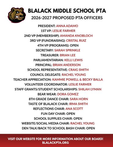 Proposed slate of Blalack PTA Officers for the 2026-27 School Year.